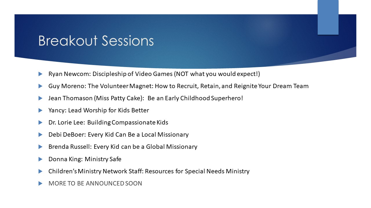 The primary mission of the Children’s Ministry Network is discipleship. The team is comprised of veteran children’s leaders who are available to provide training, support, and encouragement. We are here to come alongside churches to help equip and resource them to create engaging and safe environments where children can grow in their faith journey.